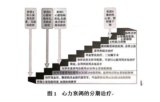 依据心力衰竭分阶段的治疗(图1)是ACCF/AHA指南倡导、中国指南响应关于心力衰竭治疗关口前移的治疗理念。主要突出心力衰竭的早防早治,以及防止反复失代偿,减少住院率,降低死亡率的治疗方针。