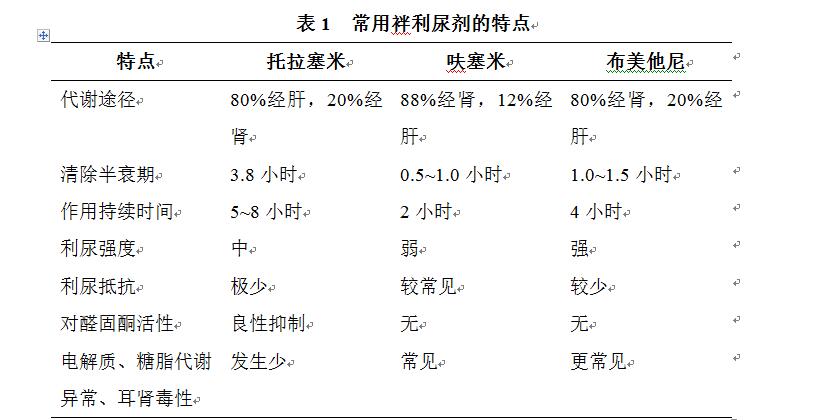 3. 利尿剂 利尿剂是改善心力衰竭症状的基石。常用的药物为呋塞米、拖拉塞米、布美他尼。袢利尿剂具有强大的利尿、利钠作用,减轻心脏前、后负荷,静脉注射还能够扩张血管、降低肺动脉楔压。肺水肿时,及时静脉注射袢利尿剂能够有效地改善患者的症状。用药剂量、途径,给药方法,合并用药的情况则应依据患者利尿的效果和症状改善的程度来决定,不要拘泥于某一个固定的剂量。用法、用量见表1。近来,针对伴有低钠血症的水肿,托伐普坦通过抑制远曲小管上血管加压素受体2,也能够产生良好的利尿减容的效果。在缓解期也可口服双氢克尿塞,剂量25~100mg/d,但在患者有明显代谢紊乱综合征的情况下要慎用,肾功能损害、肌酐清除率<30%时可能无效,与袢利尿剂有协同作用。