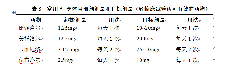 (2) β-受体阻滞剂:研究表明,合理使用β-受体阻滞剂比索洛尔、美托洛尔、卡维地洛或伲布洛尔能够显著降低心衰患者的总死亡率约34%,降低猝死发生率45%,降低因心衰而导致的死亡率49%,显著降低因心衰恶化而导致的再住院率。应用β-受体阻滞剂是需要经验和技巧的,通常开始以小剂量滴定,逐渐增加到目标剂量或患者心率和血压能够耐受的剂量。特别要注意个体化用药,而且要清楚,针对同一患者疾病的不同时期或变化,药物剂量是需要恰当调整,而不是固定不变的(表5)。