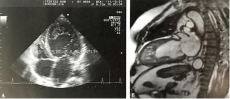 图3 超声和磁共振方法诊断心肌致密化不全 A.ALVNC超声心动图(四腔心切面);B. ALVNC磁共振(CMR)左室长轴位