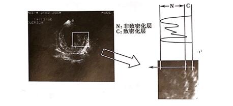 图5 2001年Jinne诊断标准的超声心动图NC/C测量方法(收缩末) N:非致密心肌层;C:致密心肌层