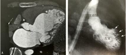 图6 CT和造影显示异常的肌小梁 LVNC的CT图像显示异常肌小梁;B.左心室造影图像显示异常肌小梁