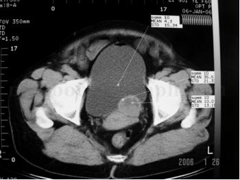 CT:CT检查示膀胱左侧壁占位病变(图33-1)。