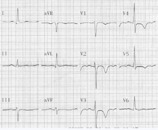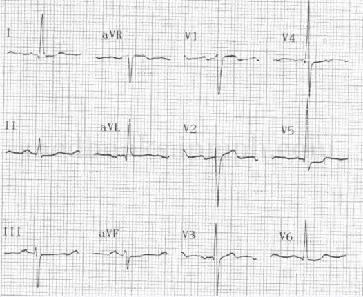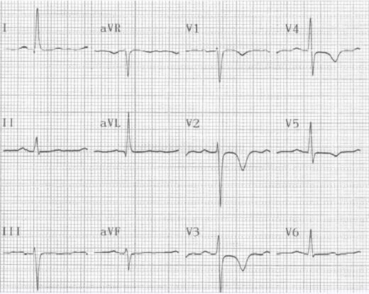 ③缓解时心电图:立即给予舌下含服硝酸甘油0.5mg,2~3min后症状缓解,T波恢复静息时倒置状态,第二日复查TnI 0.001ng/ml(参考值<0.3ng/ml)(图11-3)。
