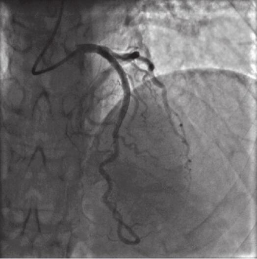 前降支近段病变处经球囊扩张后植入4.0mm×36mm支架1枚,复查造影示支架植入处无残余狭窄,血流TIMI Ⅲ级(图11-5)。