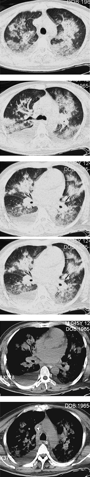 图63-3 起病第25天(入笔者医院第7天)两肺感染病灶较入笔者医院当天略见吸收