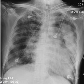 图63-1 起病第19天(入笔者医院当天)胸片提示两肺广泛感染