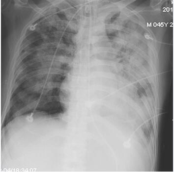 患者,男性,45岁。因“发热19天,胸闷、呼吸困难11天”于2011年2月22日转来笔者医院急诊。患者于19天前出现发热,咳嗽、咳痰等症状不明显,次日体温达40℃,当地医院常规处理后发热无明显缓解。8天后病情加剧,出现胸闷、呼吸困难。CT示两肺炎症,两侧胸腔积液。考虑重症肺炎而收住ICU,血培养提示金黄色葡萄球菌,给予常规剂量的亚胺培南-西司他汀钠和万古霉素治疗。4天前出现氧合下降,予气管插管、机械通气治疗,但呼吸、循环功能维持不佳而转来笔者医院。既往健康,否认慢性疾病史,吸烟每天2包,约25年,偶少量饮酒,水管工人。否认药物、食物及其他特殊过敏史。适龄结婚,育有二女及一子,妻子及儿女均健康。母亲健在且有高血压病史,家族中否认传染性、遗传性及其他特殊家族性疾病史。