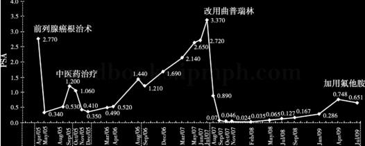 临床实际治疗方案:当年按照术后血PSA连续两次大于0.2ng/ml即判定为生化复发的标准,我们判定该患者为生化复发,考虑患者术后2个月即出现生化复发,且该例患者手术标本完整,切缘阴性,我们排除了局部复发的可能,考虑为远处转移,但当时困惑我们的是在骨扫描及腹部CT检查中我们未发现肿瘤,因此我们首先建议患者行内分泌治疗,但由于患者为50岁,有性功能方面的要求,患者被转诊到某中医医院行中草药治疗,具体方案为:西黄解毒丸+软坚消瘤片+草药方剂。期间监测睾酮水平正常,但自2005年10月至2007年7月,患者的PSA逐渐由0.35ng/ml升至3.37ng/ml,期间多次复查骨扫描及下腹、盆腔CT均未发现异常。转回我院后,我们考虑患者可能存在远处转移,给予曲普瑞林3.75mg,肌内注射1次/28天,患者的PSA迅速降为0.071ng/ml,并维持在较低水平,自2009年4月PSA升至0.748ng/ml,开始给患者加用氟他胺0.25g,1天3次。患者目前仍在随访中。患者治疗过程中的PSA变化见图39-1。
