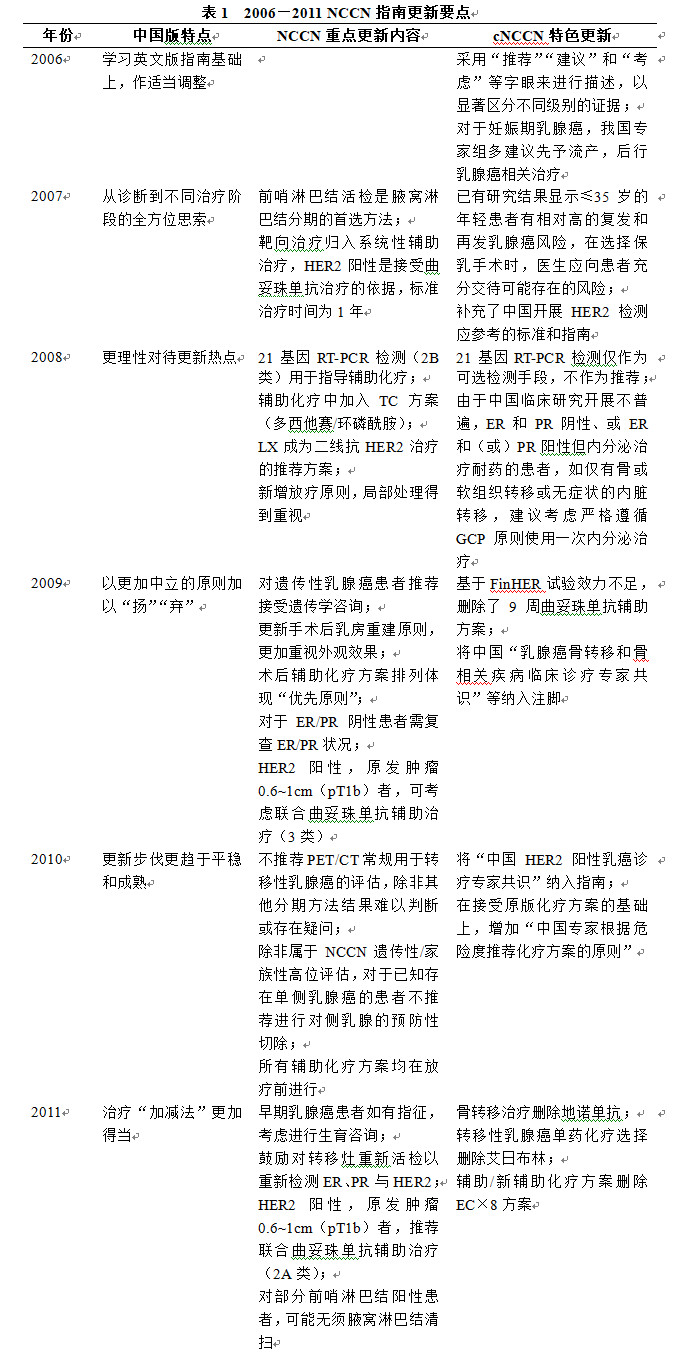 2006年,在孙燕院士的召集下,我国专家组讨论制定了第一版cNCCN指南,在学习美国版指南的基础上,结合我国实际情况,提出了适当的调整。同时为了突出“1”“2A”“2B”“3”级之间的循证等级差异,指南特别注意采用“推荐”“建议”和“考虑”等字眼来进行描述,以便将不同级别的证据显著区别开来。此时,TNM分期作为基本原则,指导乳腺癌的诊疗选择。随后乳腺癌分子分型逐渐受到重视,根据不同受体表达进行分类治疗逐渐成熟,虽然指南病并没有明确规定乳腺癌分子亚型,但结合TNM分期与受体表达情况制订治疗方案已成为乳腺癌治疗的最基本策略。总体上,乳腺癌辅助技术逐渐丰富、成熟,局部处理不断精确、低创,全身治疗更加精准、有效(表1)。
