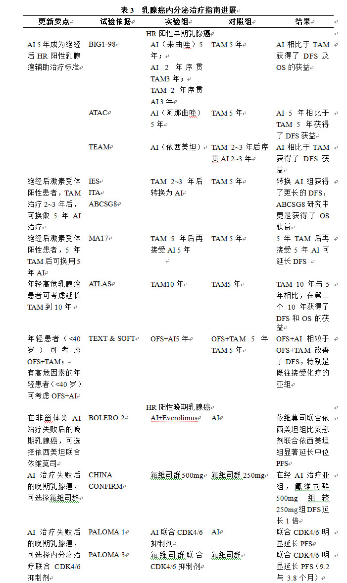 对于激素受体(HR)阳性的乳腺癌,内分泌治疗是其重要治疗手段,不论其年龄,淋巴结状态或是是否应用化疗,都应考虑接受内分泌治疗。100年前Beatson采用卵巢切除术成功治疗绝境前晚期乳腺癌,开启了乳腺癌内分泌治疗的先河。其后他莫昔芬(TAM)问世,5年TAM作为绝经前后,激素受体阳性乳腺癌患者术后辅助内分泌治疗的“金标准”已有二十余年历史。近十年来,内分泌治疗发展日新月异,不论是最佳疗程还是最佳药物,都在不断受到挑战(表3)。