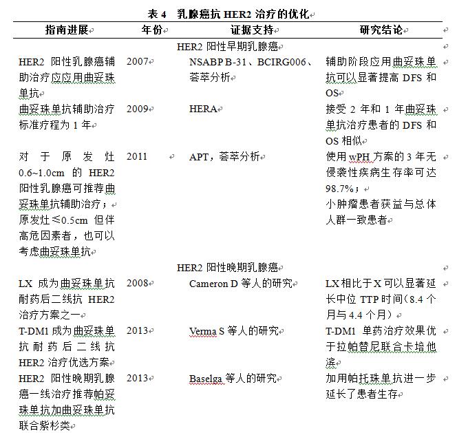 分子靶向治疗是当今肿瘤治疗领域的热点。对于HER2阳性乳腺癌,曲妥珠单抗的问世明显改善了该类患者的预后。近年来抗HER-2治疗不断发展,从建立检测标准,确定最佳疗程,到新药研发,乳腺癌靶向治疗体系正逐渐完善(表4)。