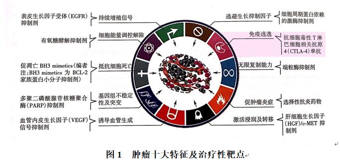 免疫逃逸是肿瘤十大特征之一。温伯格(Weinberg)教授曾于2011年发表综述中介绍了肿瘤的十大特征及其治疗性靶点(图1),其中一项特征即为免疫逃逸(avoiding immune destruction),这在当时被作者称为一种新的标志性特征;免疫逃逸也是肿瘤发生中的重要机制之一,将其作为肿瘤治疗的重要靶点,当前已成为免疫治疗的主流[1]。