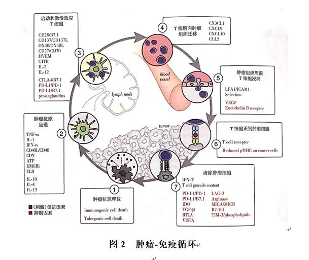 为了更好地解释肿瘤抗原如何启动免疫反应,陈和梅尔曼提出了一种肿瘤-免疫循环(cancer-immunity cycle)的新概念(图2)。相对于正常细胞,肿瘤细胞自身通常携带大量的基因突变,这些突变的积累将诱导新抗原(neoantigen)产生并表达在肿瘤细胞的表面上,即肿瘤特异性抗原。突变的负荷与新抗原的产生概率呈正相关。肿瘤细胞的死亡(如放化疗等治疗后),将促进大量的新抗原入血,通过抗原递呈细胞(APC)刺激T淋巴细胞增殖并向肿瘤浸润、识别和杀伤肿瘤细胞,但肿瘤微环境可使肿瘤细胞逃逸T细胞介导的杀伤。如图中所示,其中每一步都是由刺激因子和抑制因子共同调控,如细胞毒性T淋巴细胞相关抗原4(CTLA-4)可以通过调控步骤3阶段的T细胞增殖反应而抑制主动免疫应答形成,而程序性死亡分子配体1(PD-L1)则对步骤7阶段的主动免疫应答发挥抑制性的调控作用。其中部分通路或分子的异常活化将抑制免疫系统(尤其是T细胞)对肿瘤细胞的及时清除,相对肿瘤而言产生免疫耐受,甚至促进肿瘤的生长。肿瘤免疫治疗的目的是通过启动或重新启动自我维持的肿瘤-免疫循环[2]。