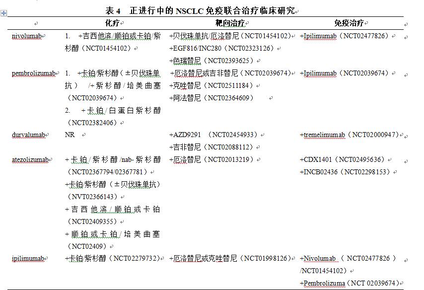 2015世界肺癌大会(WCLC)上,公布了atezolizumab联合化疗一线治疗转移性NSCLC患者的ⅠB期临床试验(2015 ASCO abstract 8010)。研究的主要终点是ORR。以atezolizumab 15mg/kg Q3W与不同含铂化疗方案分为3组:atezolizumab+TC,atezolizumab+nab-PC,atezolizumab+AC。atezoli的剂量为每3周一次静脉注射15mg/kg,治疗维持4~6个化疗周期,之后序贯atezolizumab维持治疗直到疾病进展(以及根据需要增加培美曲赛维持治疗)。结果显示新确诊转移性非小细胞肺癌(NSCLC)患者对化疗联用PD-L1抑制剂atezolizumab有预期应答率是化疗的两倍。总体而言,评估的41名患者中,将近2/3患者对atezolizumab联用含铂化疗方案表现出客观应答。应答率最高的方案是atezolizumab+AC方案,13/17(76.5%)的患者对此方案有部分应答。4名患者对atezolizumab+nab-PC方案有完全应答[15]。而评估atezolizumab与不同化疗方案的联合的多中心、Ⅲ期随机对照临床试验正在入组中(2016 ASCO abstract 9103)[16](表4)。