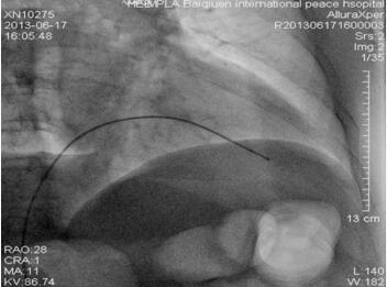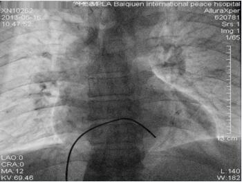 图1-23-7 临时起搏电极位置(较急诊影像比较临时起搏器电极头端向前移位)
