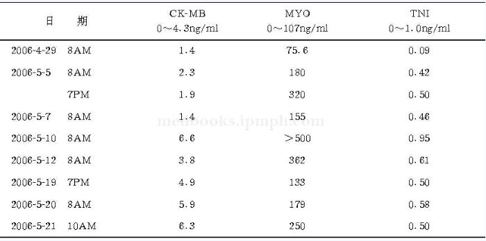 入院时诊断为脑梗死(右侧大脑中动脉主干闭塞),心律失常(心房纤颤)。入院当天CT扫描提示右侧大脑半球、基底核密度稍减低,右侧颞叶脑沟变浅,右大脑中动脉供血区灌注降低(图1)。予以静脉输注前列腺素E10μg,每日1次;田七人参注射液350mg,每日1次;20%甘露醇125ml,每6小时1次;甘油果糖250ml,每12小时1次;口服阿司匹林肠溶片100mg,每日1次;福辛普利5mg,每日1次;美托洛尔12.5mg,每日1次;尼卡地平40mg,每日2次;胺碘酮100mg,每日2次。经上述治疗病情基本平稳。入院第4天复查头颅CT扫描,提示右侧大脑中动脉供血区域大面积脑梗死(图2)。入院第7天晨起突感胸闷,持续30分钟,但不伴胸疼,舌下含服硝酸甘油后有所缓解。进一步检查发现双肺呼吸音粗,肺底可闻及少许湿啰音;心率62次/分,律不齐,未闻及杂音;双下肢无水肿。此时心肌酶检测在正常范围(表1)。心脏Doppler超声显示左心扩大,左室节段性运动不良,左室壁肥厚。心内科会诊后不排除冠心病可能,增加口服单硝酸异山梨酯缓释胶囊50mg,每日1次;劳拉西泮0.5mg,每晚1次;胸闷有所好转。当日下午2时再次胸闷不适,同时右腿麻木、疼痛,双下肢膑骨下10cm处周经(右侧31.6厘米,左侧31.2厘米)基本对称。舌下含化硝酸甘油0.5mg后胸闷稍有缓解。入院第9天下午2时右侧髋关节疼痛,但测量双下肢周径较前无明显变化,经口服布洛芬缓释胶囊0.3g、加强活动和热敷后疼痛缓解。入院第11天双下肢轻度凹陷性水肿。入院第12天上午9时胸闷憋气加重,舌下含化硝酸甘油(0.5mg)不能缓解。复查心肌酶仍在正常范围内;心电图显示窦性心动过速(132次/分),右束支传导阻滞,V1~V4导联ST段压低明显,T波倒置。考虑心功能不全,予以呋塞米40mg,每日静脉注射1次;硝酸甘油5mg加入生理盐水49ml,每小时6ml泵入;地高辛0.125mg,每日口服1次;抬高床头30度;症状略有好转。当日下午5时胸闷、憋气明显,血气分析(表2)提示低氧血症(PaO247﹒6mmHg)、低碳酸血症(PaCO231﹒0mmHg)、轻度碱中毒(pH7.513)。再次复查心肌酶仍在正常范围,但D‐二聚体(正常值<0.4mg/L)连续3次增高(5.5mg/L,2.6mg/L,1.4mg/L)。床旁X线胸片(图3)显示心影增大。根据上述临床表现过程拟诊断为肺血栓栓塞,立即开始抗凝治疗。予以口服华法林,每日3mg;皮下注射低分子肝素4000IU,每12小时1次;同时监测凝血指标(表3),并调整药物用量。入院第14天左胸前区阵发性钝痛,伴胸闷、憋气。查体心音有力,心律不齐,未闻及杂音;两肺可闻及湿啰音。因病情加重转入神经内科重症监护病房(N‐ICU)。转入当天胸部螺旋CT扫描提示双侧肺动脉中心型血栓栓塞(图4)。下肢血管超声检查提示右下肢腘静脉前壁附壁血栓形成,左侧胫前静脉和胫后静脉远端、双腓静脉血栓形成,双下肢静脉红细胞聚集征,左侧下肢静脉瓣功能轻度不全(图5)。国际标准化比率(INR)2.67,活化部分凝血酶时间(APTT)69s。继续抗凝治疗,并抬高双下肢,改善血液回流。此后病情逐渐趋于稳定,未再诉胸闷、胸痛、气短不适,双肺呼吸音清晰,双下肢水肿消退,N‐ICU治疗22天后病情平稳转回普通病区。入院50天病情好转出院。继续口服华法林3mg,每日1次,连续11个月。
