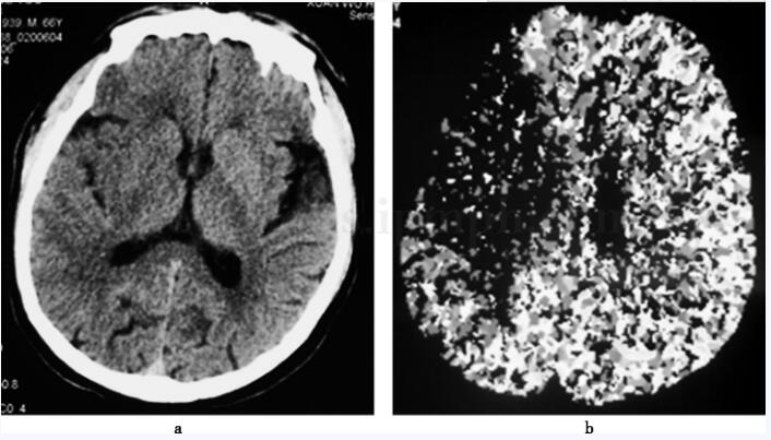 右侧大脑半球、基底核密度稍减低,右侧颞叶脑沟变浅(a)。灌注脑血容量图:右侧大脑中动脉供血区脑血流量较对侧明显减少(b)