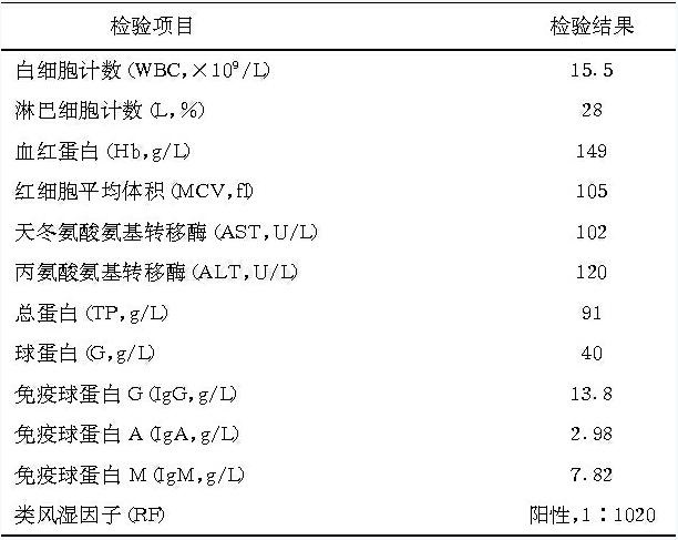 答:异常的检验结果包括白细胞计数(WBC)、球蛋白(G)、天冬氨酸氨基转移酶(AST)和丙氨酸氨基转移酶(ALT)、总蛋白(TP)、血清免疫球蛋白M(IgM)浓度显著增高;类风湿因子(RF)试验阳性,免疫固定电泳显示有M蛋白。最显著的临床和实验室结果是anti‐HCV和CG为阳性。