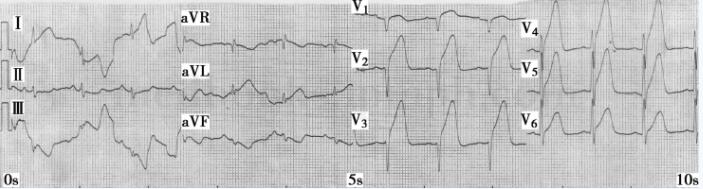 辅助检查:急诊心电图:广泛前壁心肌梗死。冠状动脉造影:前降支近中段在第一对角支发出处完全闭塞,回旋支、右冠无明显狭窄。生化:空腹血糖6.28mmol/L,TG2.83mmol/L,AST215.1U/L,CK2196U/L,CK‐MB170.2U/L。2011‐7‐9:肌钙蛋白T>2ng/ml,NT‐proBNP475pg/ml。心脏彩超:LAD 36mm,LVDd49mm,IVS12.5mm,LVPW10mm,EF65%,室间隔稍厚,左心室舒张及收缩功能正常。心电图检查见图1~图2。