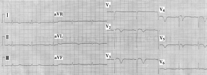 图2 窦性心律,V1~V4导联Q波形成,T波倒置