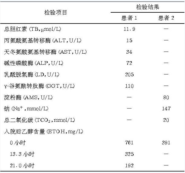 答:两患者血清乙醇(ETOH)含量均显著增高。其中,患者1的ETOH浓度是患者2的2倍,且增高持续24小时以上。患者γ‐谷氨酰转肽酶(GGT)增高。