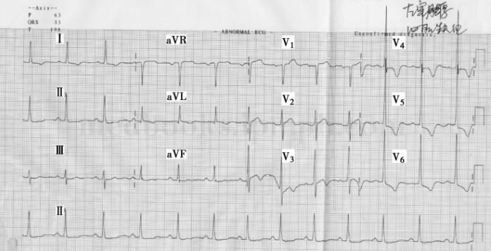图1 窦性心律,V1~V3导联ST段略有抬高,V4~V6导联ST段下移,T波倒置