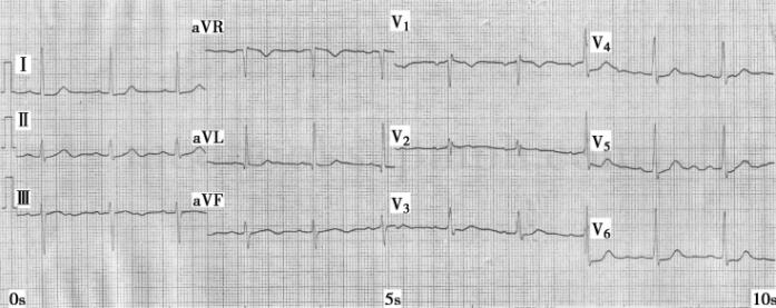 图1 入院前心电图:窦性心律,不完全性右束支传导阻滞,V5~V6导联ST段压低约0.2mV