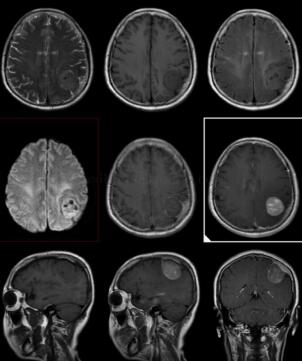 轴外肿块,多为均质性,可有坏死、囊变和钙化,易引起邻近骨质增生或受压变薄膨隆,病灶周围不同程度水肿(压迫引流静脉)。CT显示肿瘤界限清楚,大多数脑膜瘤实质部分为高、略高或等密度。MRI上与灰质相比,典型者各序列均为等信号,或呈T1略低、T2略高或高信号;约10%肿瘤信号变化不定。可见血管流空信号。增强扫描肿瘤实质部分明显、均匀强化。