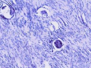 图2 瘤细胞梭形,编织状排列,见砂粒体