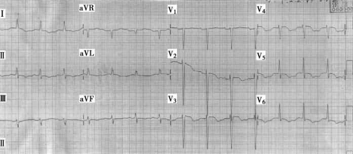 图1 窦性心律,Ⅰ、Ⅱ、V4~V6导联T波倒置,肢体导联低电压