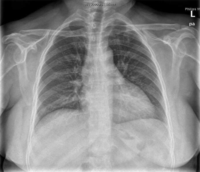 急诊生化:ALT710.7U/L,AST2585.7U/L;U REA4.9mmol/L,CREA97μmol/L,UA337μmol/L,K+3﹒54mmol/L。尿常规隐血+++。便常规无异常。血常规:WBC16.57×199/L,N89.9%。BNP>9000pg/ml,尿渗透压222mOsm/(kg•H2O)。凝血:D‐二聚体6593ng/ml,APTT58.9秒,PT 38﹒7秒。甲状腺功能:FT31﹒03pg/ml,T43﹒36μg/dl,FT40﹒388ng/dl,T30﹒408nmol/L,TSH0.12μIU/ml。血清泌乳素测定0.22ng/ml,血清促卵泡刺激素测定1.00IU/L,雌二醇测定15pg/ml,睾酮测定0.01ng/ml,孕酮测定0.15ng/ml,血清促黄体生成素测定0.19MIU/ml。皮质醇节律(0点、8点、16点):1002nmol/L、413.4nmol/L、1391nmol/L;ACTH(0点、8点、16点):74.1pg/ml、41.6pg/ml、47.2pg/ml。心电图检查见图1。心脏彩超:LVDd60mm,EF 46%,左心房、左心室增大,心包积液(少量)。胸片(2011‐7‐3)检查见图2。