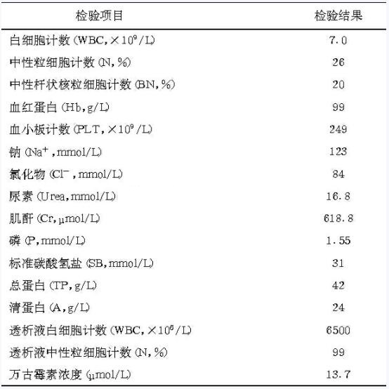 答:患者腹膜透析液浑浊,直接涂片革兰染色检出革兰阳性球菌,而透析液细菌培养革兰染色检出革兰阴性球菌,并鉴定为干燥/浅黄奈瑟菌感染,透析液白细胞计数(WBC)为6500×106/L,99%为中性粒细胞(N),中性杆状核粒细胞计数(BN)增高;肌酐(Cr)、尿素(Urea)增高,钠(Na+)、氯化物(Cl-)和血红蛋白(Hb)偏低。