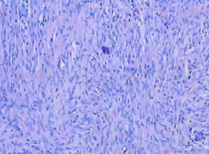 图2 瘤细胞梭形,束状排列,局灶呈栅栏状排列,偶见核分裂,未见坏死