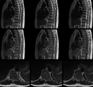 图1 胸11椎体左后部、左侧横突及棘突信号减低,左侧椎间孔开大,见低信号肿物向椎管内生长,脊髓受压向右前方移位,椎管内占位上下径线约35.9mm,最大截面约12.5mm×5.8mm。扫描所见肝右叶类圆形长T2小结节,直径约8.2mm