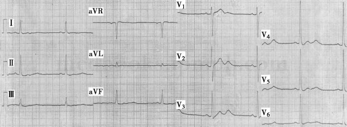图1 心电图:窦性心动过缓,心率50次/分,T波低平,U波形成