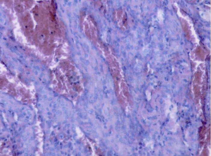 (3)海绵状血管瘤样区:瘤细胞间形成大量血管样腔隙,腔内充满红细胞,腔壁衬覆立方状细胞。