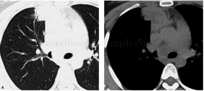 PMBCL是一种快速进展的肿瘤,肿块多为巨块型但仍局限性累及胸腔内脏器,而无外周淋巴结、骨髓及中枢神经系统(CNS)受累。PMBCL呈弥漫性浸润性生长,可侵及肺组织、胸膜、心包膜及邻近神经血管结构,使其发生纤维化及坏死,尤其是对肺组织。本例CT图像示右肺邻近肺组织受侵改变,考虑与此生物学特征有关。其形态学上表现为弥漫增生的肿块,伴肿块内密度不等的纤维化。少数情况下,当肿瘤扩散时,可累及肾脏、肾上腺、肝、皮肤和脑等结外部位。