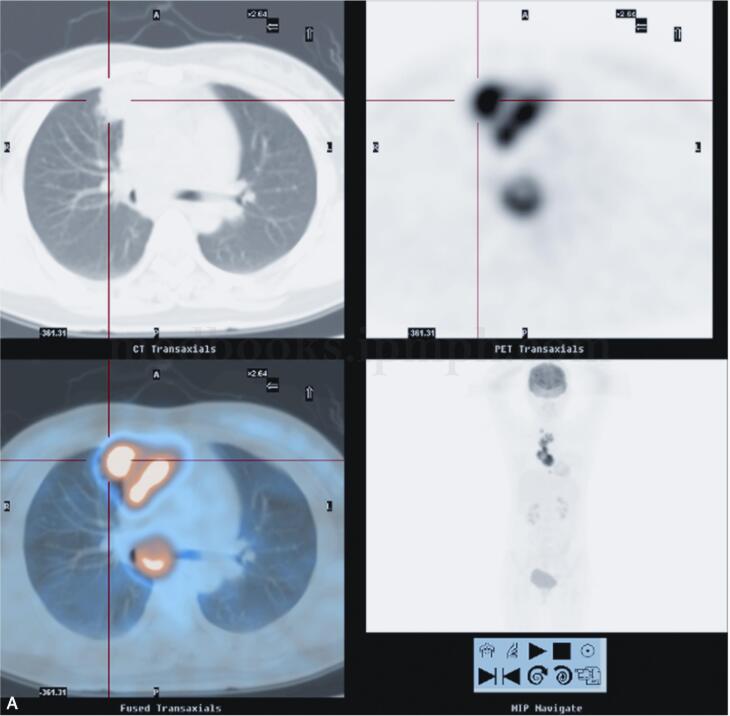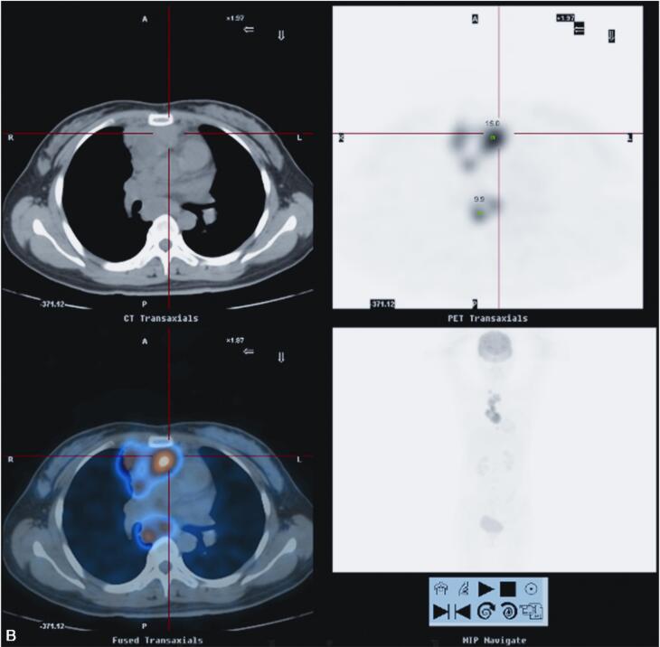 2010年5月10日于我院18F-FDG PET/CT检查:纵隔内及右肺上叶前段病变,代谢异常升高,考虑慢性感染性疾病可能性大(结核肉芽肿?),请结合临床,进一步完善结核相关检查,必要时纵隔镜活检以除外恶性病变(图2)。