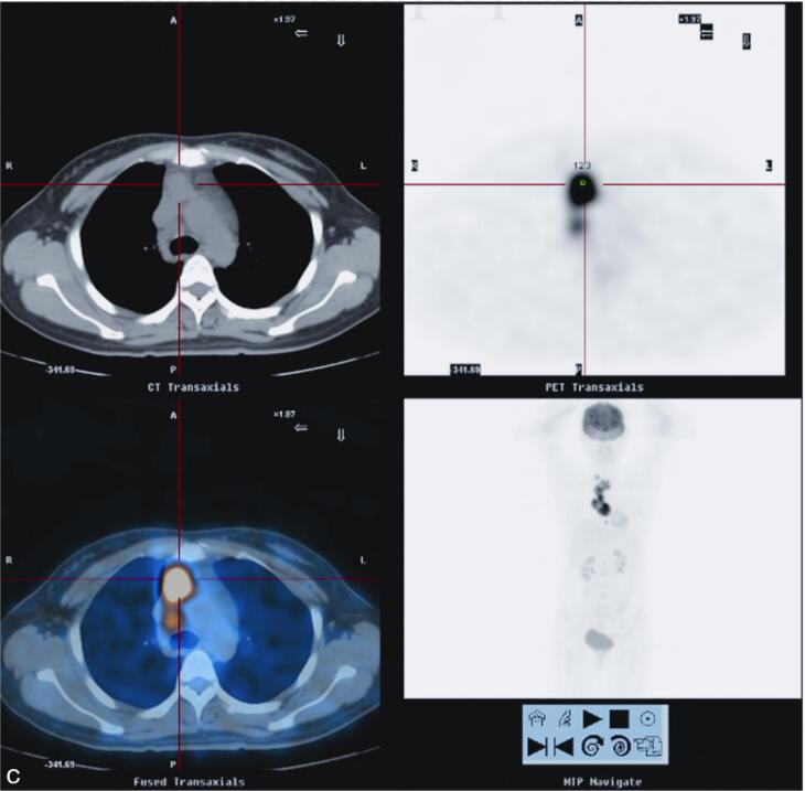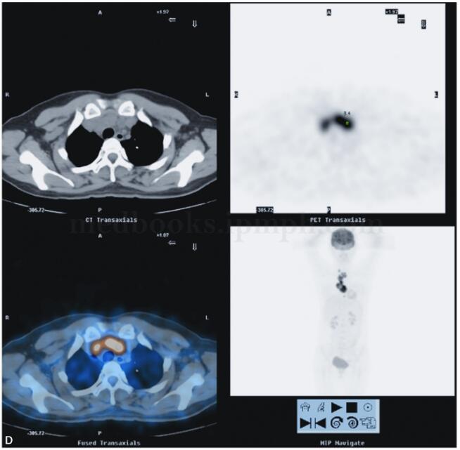 图2 PET/CT示右肺上叶前段纵隔旁见高密度实变影,内见充气支气管影,FDG代谢放射性分布异常浓聚(SUVmax=12.4)。前纵隔内见软组织密度肿块影,最大截面积约为5.2cm×3.0cm,其内密度不均,见低密度坏死区,实质区FDG代谢放射性分布异常浓聚(SUVmax=15.0),邻近心包;右锁骨上、前上纵隔、主肺动脉窗,气管叉下(其内见钙化灶)及心包右旁见肿大淋巴结影,部分融合趋势,FDG代谢放射性分布异常浓聚