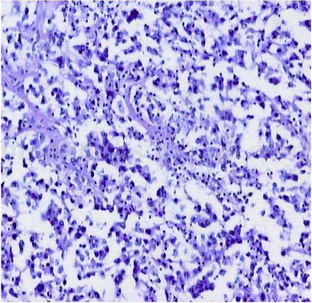 孤立的恶性纵隔肿瘤,单凭临床表现及X线影像学特点很难区分,故PMBCL术前诊断相对困难,组织病理学为的诊断的金标准。标本获取则依靠组织活检(包括细针穿刺、组织芯活检)和手术切除。其病理学特点主要为,①大体病理:大多位于胸腺位置,肿块表面呈灰白色,粗糙,包膜不完整,与周围组织界限不清;②组织细胞学:形态学改变以弥漫增生的瘤细胞及细胞间不同程度的纤维化为特征,但与外周DLBCL无特异的形态学区别;③免疫组化:免疫表型检测:大多数表达表面免疫球蛋白(sIg),通常为IgM,免疫母细胞性和浆母细胞性变型常可表达胞质免疫球蛋白(cIg),而不表达sIg,表达B细胞相关抗原CD19、CD20、CD22和CD79a。