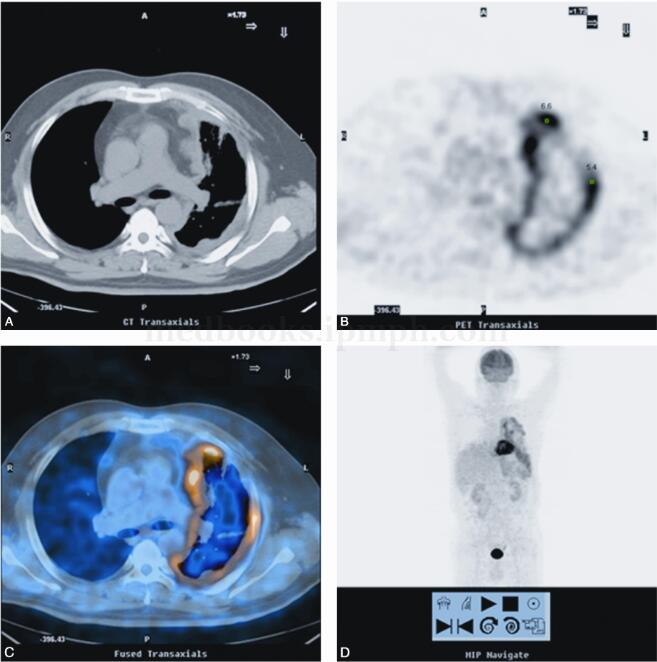假阳性与假阴性:18F-FDG显像的假阳性包括良性炎症性胸膜炎、结核性胸膜炎、良性胸膜石棉性斑块、肺周围渗出以及滑石胸膜固定术后,上述病变所产生的炎症过程激活巨噬细胞,使其摄取18FFDG增加所致。假阴性主要见于极少数代谢无明显增加的低恶性胸膜间皮瘤。