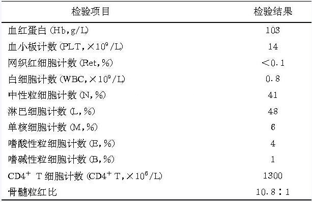 答:患者血红蛋白(Hb)、血小板计数(PLT)、网织红细胞计数(Ret)和白细胞计数(WBC)均减低,CD4+T细胞计数(CD4+T)显著减低。骨髓细胞不足、红细胞形成不全,涂片中见巨原红细胞;骨髓粒红比显著增高;血清中检出HPVB19DNA。