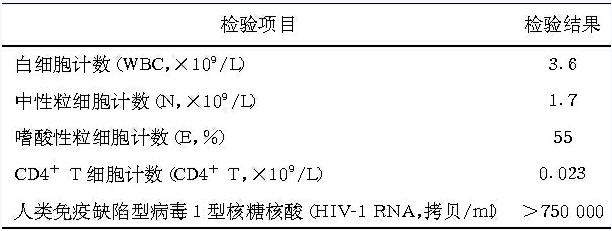 答:患者嗜酸性粒细胞计数(E)明显增高,CD4+T明显减低、伴HIV‐1RNA量明显增高,HIV‐1p24抗原阳性,但未检出HIV抗体,支气管肺泡灌洗液P﹒carinii六胺银染色阳性。