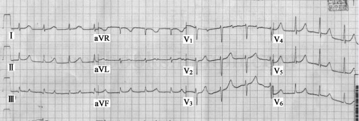图1心电图:一度房室传导阻滞(PR间期长达0.38秒),二度Ⅰ型房室传导阻滞
