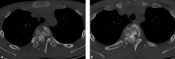 图1 CT:胸2椎体及附件骨质破坏,呈菜花状改变,胸2椎体受累,部分碎骨块突入相应椎管内,椎管狭窄