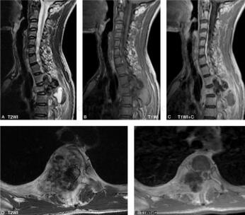 图2 MR:胸2椎体及附件骨质破坏,椎体变扁,呈菜花状改变,相应椎管内呈不规则稍长T1、短T2信号,棘突旁见囊状长T1长T2信号,后方见短T2信号,两者间见液液平面。增强扫描边缘强化