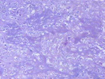 良性骨母细胞瘤的组织学表现有3大特征:①丰富的骨母细胞;②间质有丰富的血管;③丰富的骨样组织互相连接成条索状,其中有不同程度的钙盐沉积形成排列规则的骨小梁。恶性骨母细胞瘤是介于良性骨母细胞瘤和骨肉瘤之间的一种中间性肿瘤,它可由骨样骨瘤和良性骨母细胞瘤发展而来,也可以一开始即表现为具有侵袭性生长特性。病理方面除具有良性骨母细胞瘤的一般病理特征外,同时出现异型的巨型上皮样骨母细胞或印戒状骨母细胞,可见核分裂象;骨小梁不规则,但无飘带状骨样组织,也无肿瘤性软骨组织;肿瘤组织可呈侵袭性生长,但与被侵犯的周围组织分界清楚,可出现反应性新生骨板及纤维组织增生带;破骨样巨细胞数量相对较少。病变向软组织侵犯,可形成软组织肿块。