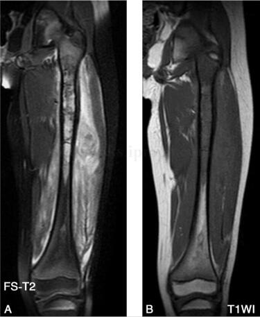 MRI显示病变在髓内浸润范围、瘤内及软组织内出血比平片和CT敏感,但显示钙化、骨化和骨膜反应不及后两者。T1WI示髓腔内边界不清的斑点状低中信号,增生骨膜与骨皮质融为一体,呈低信号区,其内尚见斑点状中等信号区;骨干周围有稍高于肌肉的梭形软组织肿块。T2WI示髓腔内斑点状高中混杂信号,软组织肿块信号更高。合并出血时信号混杂。MR增强可用于区别肿瘤坏死组织和不成熟的骨样肿瘤成分,前者T1WI为低信号,T2WI为明显高信号,增强后不强化;后者在T1WI为低信号,T2WI为稍高信号,增强后有强化。