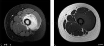 图2 MR:左股骨中上段髓腔内见长T1、长T2信号改变,局部肿胀增粗,左股骨局部外侧缘见层状骨膜反应,周围肌肉组织呈长T1、长T2信号改变